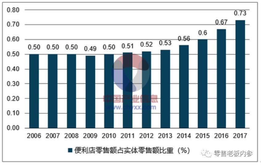 《零售老板内参》APP(微信ID:lslb168)注意到,2017年便利店增速达到12%,连续第八年保持两位数左右的水平。便利店占实体零售额的比重也逐年上升,由2006年的0.5%上升至2017年的0.73%。由此可见,便利店经济反而是实体经济中稳稳前进的黑马。