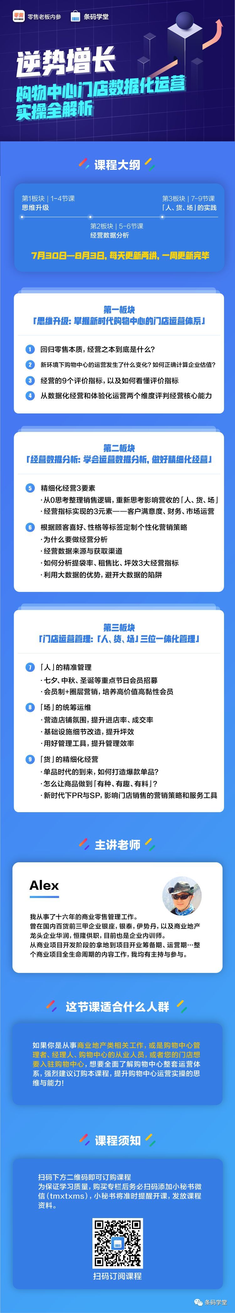 条码学堂邀请到华润置地购物中心总经理Alex老师讲授《逆势增长 | 购物中心门店数据化运营实操全解析》。