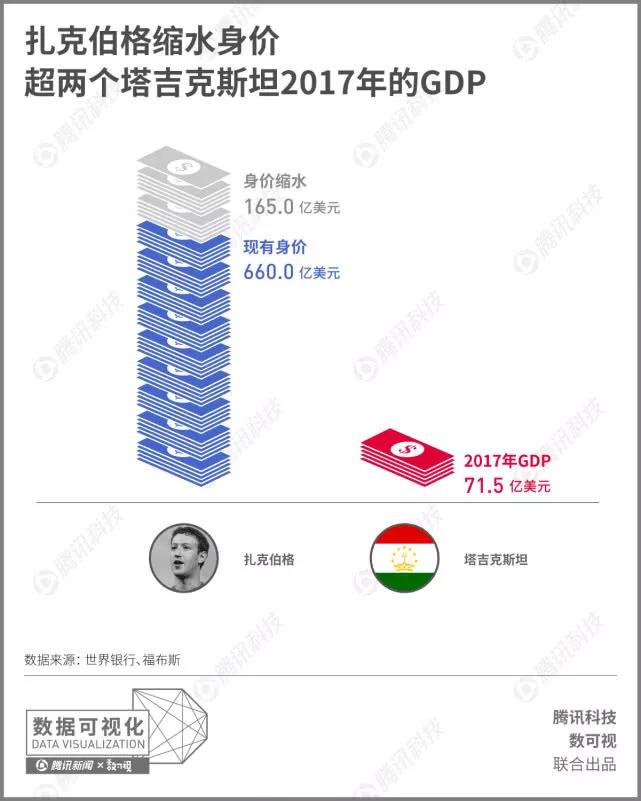 Facebook股价的下跌,也让其创始人马克·扎克伯格的个人财富下跌20%至660亿美元,缩水165亿美元,该金额超过两个塔吉克斯坦2017年的GDP(其2017年GDP为71.5亿美元)。