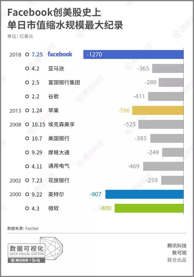 而Facebook这次遭遇的股价“滑铁卢”,更是美国证券史上损失最大的一次,创下美股史上单日市值缩水规模最大纪录。此前,市值缩水规模最大的是英特尔,2000年9月,其市值在一天内缩水907亿美元。