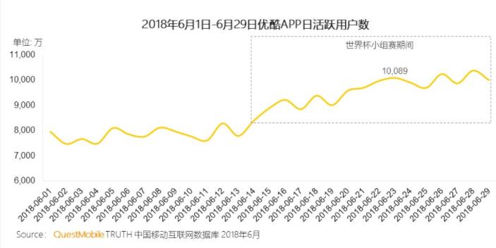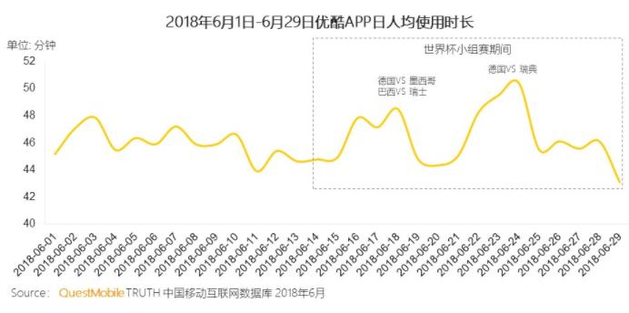 据2018年7月QuestMobile《世界杯小组赛数据洞察报告》显示,世界杯小组赛开赛后,优酷日活跃用户数破亿,较6月非比赛期间增长22%。世界杯小组赛期间,优酷APP日人均使用时长峰值达50.4分钟,较6月非比赛期间增长9.8%。