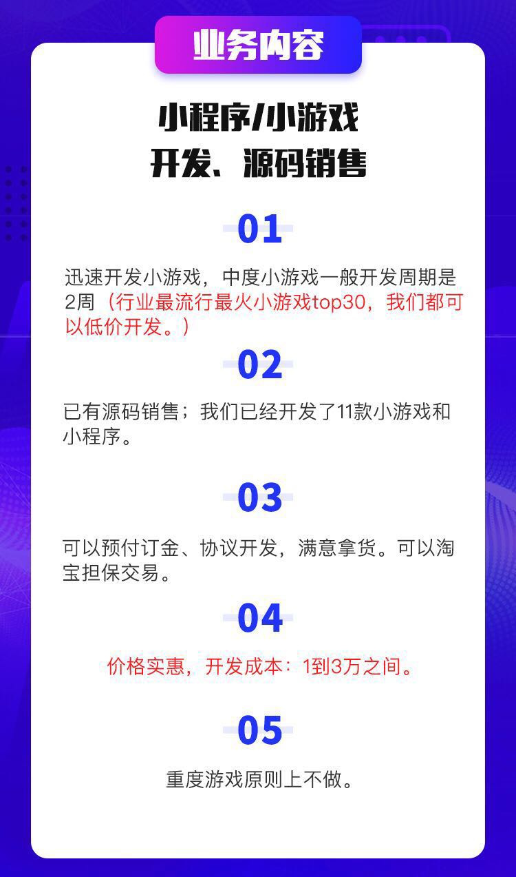 同时,36氪还得到了一张价格表,除了跳一跳、海盗来了等顶级小游戏确定不开发以外,从第4名的欢乐球球到第30名的呆呆打僵尸,除了等顾客报价决定做不做的或正在开发的,已经开发好的小游戏有18款,价格区间在2.5w到12w不等,预付订金为10%,像爆款小游戏《欢乐坦克大战》的复制周期一个月不到,报价12万。在7月初的微信小游戏公开课上亮过相的《神手》只需要9天,报价4万。可以当面或淘宝、a5上担保交易。