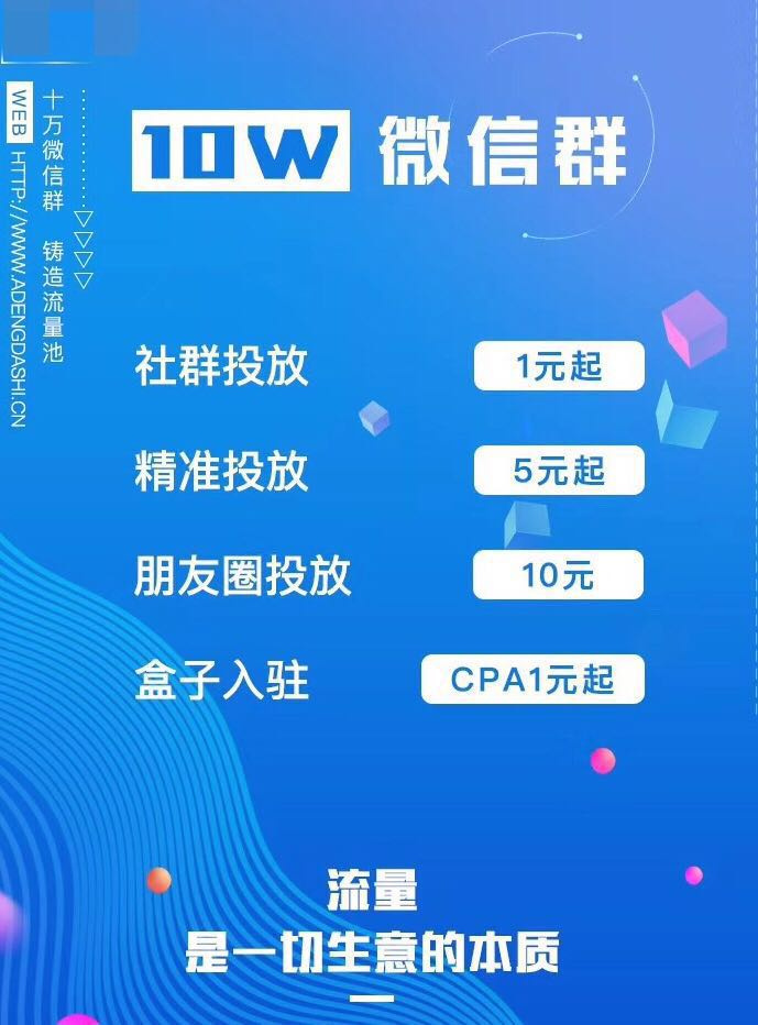 市面上的流量公司分为两类。第一类以纯推广,即分享为主,不含注册用户,不保证点击量,这被称为CPC模式。主要的方式有:社群投放(普通群聊)、精准投放(目标人群聊,例如学生群、宝妈群、一线城市群等)、朋友圈投放和盒子入驻。价格根据具体的分享数量而定,不同方式,单价不同。