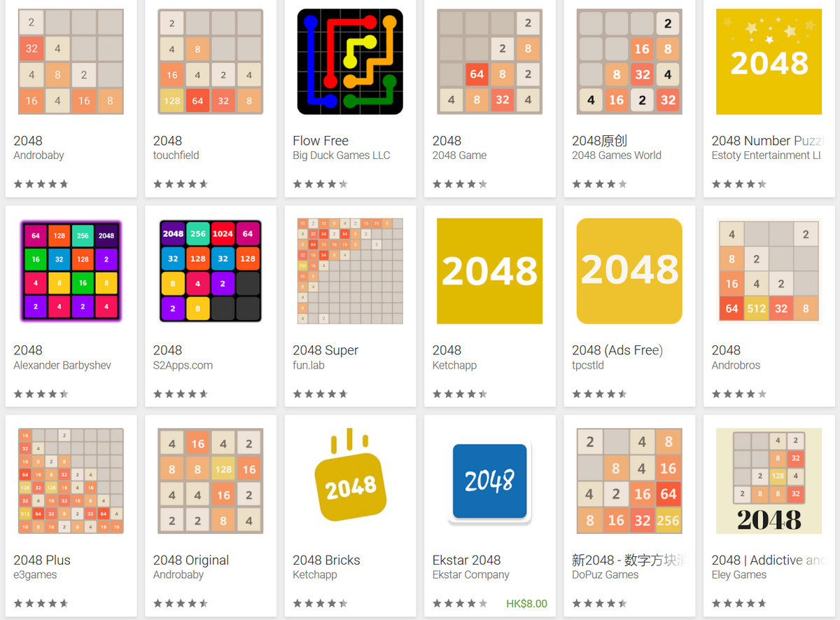 《2048》火了之后,谷歌应用商店里又衍生出上百个相似的《2048》。