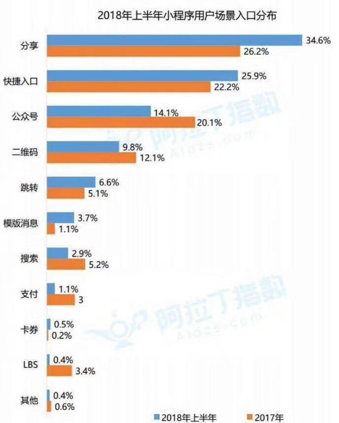 根据阿拉丁“2018年上半年小程序生态白皮书”的数据来看,“分享”以34.6%,位列用户场景入口的第一位,较2017年增长8.4%,也已大比例超过“快捷入口”的25.9% 和“公众号”的14.1%。