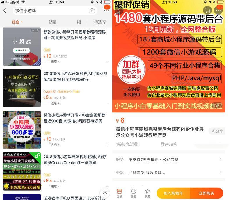 小游戏的轻量化,使得复制成本也很低。淘宝上,成千上百套小游戏源代码打包出售的价格为6元到10元,拍下自动发货。