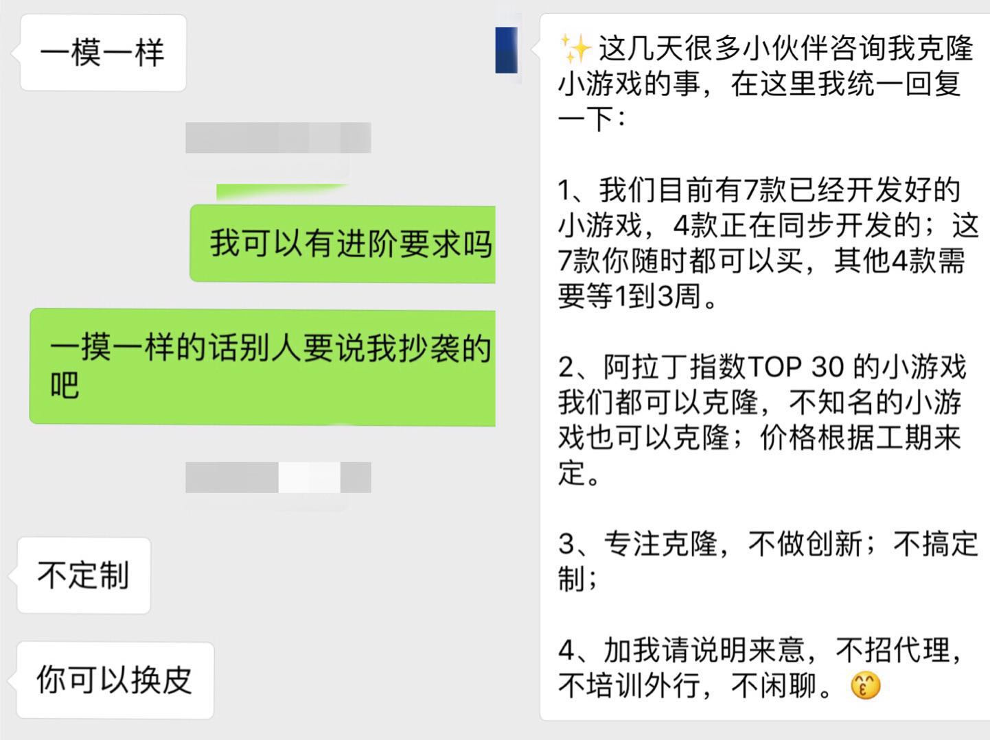 36氪根据广告中张贴的二维码,联系到微信名为“飞”的销售,连招呼都还没打,对方就发来一条设置好的微信,“阿拉丁指数TOP 30 的小游戏我们都可以克隆,不知名的小游戏也可以克隆;价格根据工期来定。已经开发好的游戏可以直接付款买走,正在开发的几款大约需要等1-2周。”