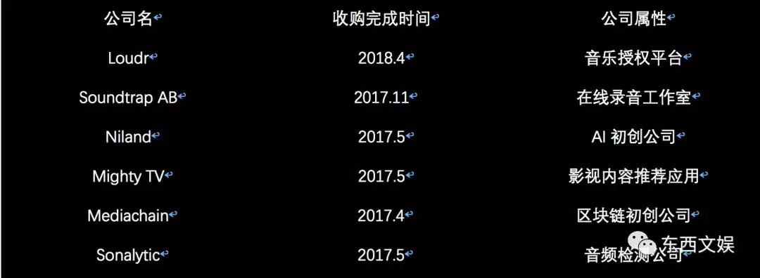 Your Daily Mix、Release Radar、Discover Weekly、Fresh Finds等等歌单和推荐功能获肯定的同时,值得关注的还有在“发展双边市场,开发B端工具”的方针指导下,Spotify针对行业专业资源的持续整合,从2017年-2018年前后Spotify的收购动作中,多少也能看出Spotify在智能优化上长线布局所作出的储备: