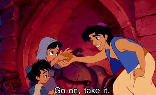 例如,在电影《阿拉丁》中,阿拉丁是一个傲慢自大的街头霸王。我们看着他偷面包,轻而易举地逃过追打他的人。此时我们还不能确定阿拉丁是否是好人,直到他正要吃偷来的面包时,故事插入了“save the cat”。阿拉丁看到两个饥饿的孤儿,就把面包递给了他们。这时我们才知道阿拉丁是一个善良的人。他对弱者表现出了善意,大家就开始喜欢他了。