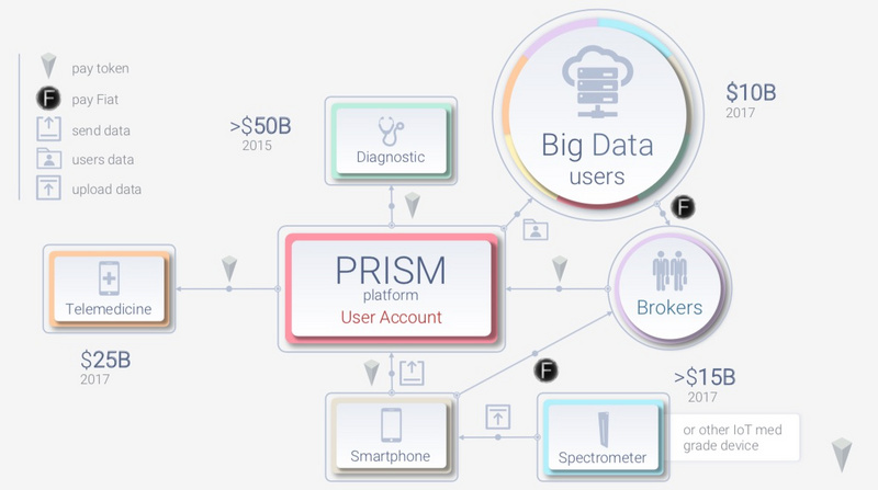 医疗数据集成平台并不少见,目前市场上潜在的竞品公司有三类:独立物联设备制造商、医疗级别硬件商;传统的医疗数据经纪商如艾美仕市场研究公司(IMS Health);区块链数据平台项目MediBloc、Patientory、Medicalchain 等。针对竞品,PRISM 团队认为其竞争优势同时在于:1、检测设备为医疗专业级别且价格平民;2、医疗数据收集由自身完成而非依赖于医院数据;3、用户可交易自身医疗数据也可实时监测自身健康状况。