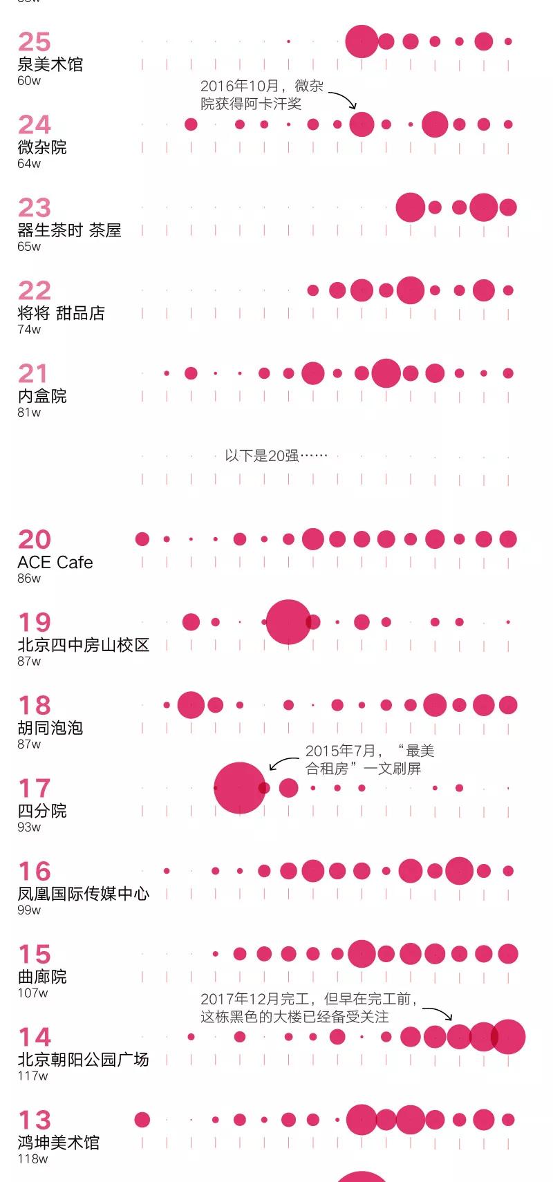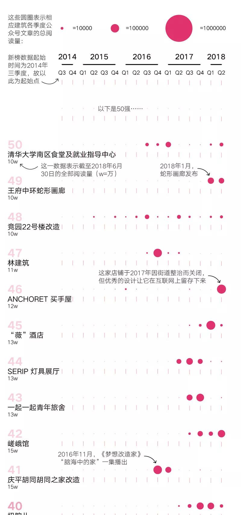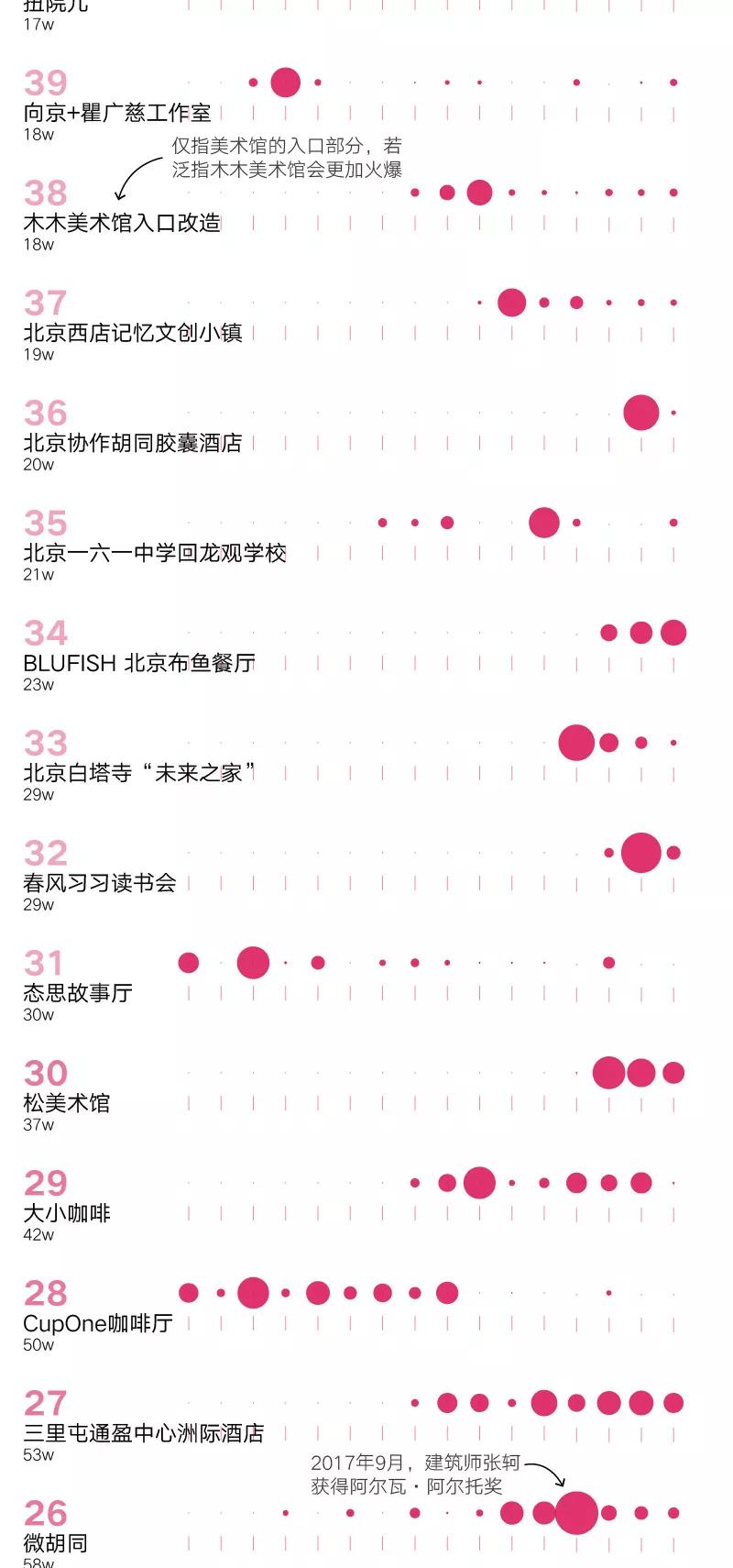 关于网红的问题,要交给网络去评判。受精力所限,我们选择了与这座建筑有关的微信公众号文章阅读量(统计自“新榜”)作为唯一的评判标准。而评判的对象则是185座在2010年之后已完工的建筑、景观和室内设计作品(所以,故宫、鸟巢等更早建成的建筑,和新机场、中国尊等尚未完工的建筑并不在名单之列)。它们包括了截至今年6月底 archdaily(全球最大的建筑网站)所有含有“北京”标签的新建筑,和一些我们人为补充的建筑。此次调查中,我们更关注的是建筑,而非建筑师,所以下面的图表中并没有列出每个项目的建筑师。又受篇幅所限,我们只呈现了总阅读量排名靠前的50座建筑。不过,你可以点击文末的“阅读原文”来浏览参评的185座建筑的含有建筑师信息的完整名单。关于调查方法的更多解释说明也在文末(不然这个开篇就要更长啦)。