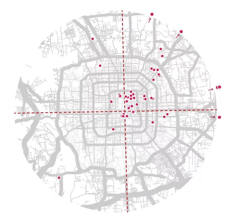 在下面的地图中,我们标出了排名前50的网红建筑的所在位置(红色圆点)。如果依照中轴线和长安街将北京划为四个象限(红色虚线),网红建筑的分布便显得更加分明。我们仿佛能看到一条“网红建筑走廊”,从老城中心沿机场高速向东北方向延伸出去——