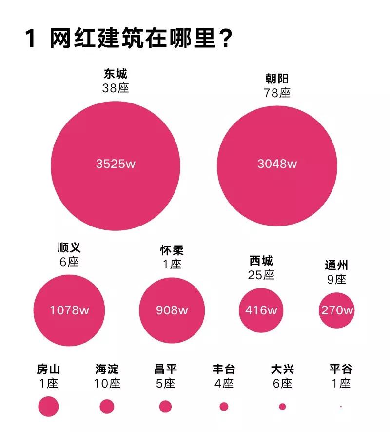 我们计算了这185座建筑都来自哪个城区以及各个城区建筑的微信公众号总阅读量。其中,北京面积最小的城区——东城区却是网红建筑人气最高的区,朝阳区紧随其后。