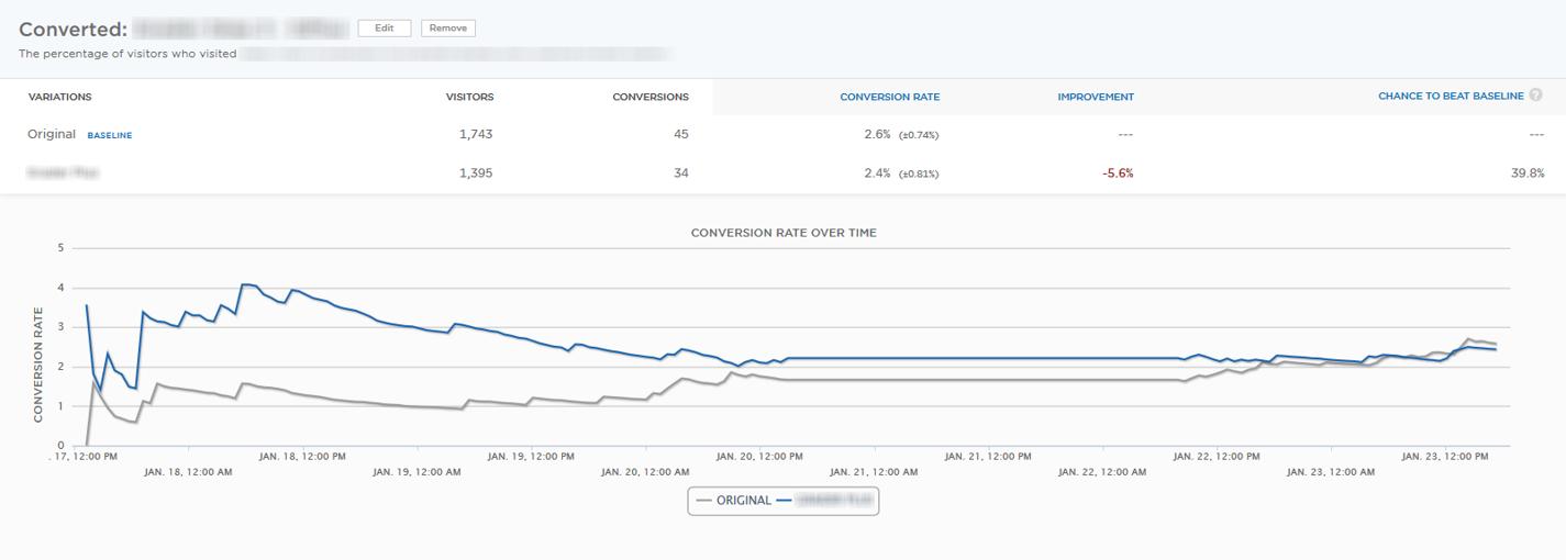 下面通过实例,来看看页面上这些小调整带来的收益究竟是什么吧。下面是一个着陆页A/B测试的例子,底部的灰色线是正在运行的版本A,蓝线是对应的版本B。一开始,新页面远远超过了旧页面,棒极了,对吧?