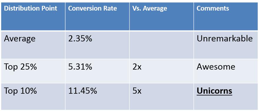 能够看到,电子商务的平均转化率要低得多,尤其是与金融行业相比。但是,前10%帐户的转换率,都比所在行业的平均值高出3到5倍。所以可以看到,无论在哪个行业,顶级转化率高于平均转化率3—5倍,都是成立的。