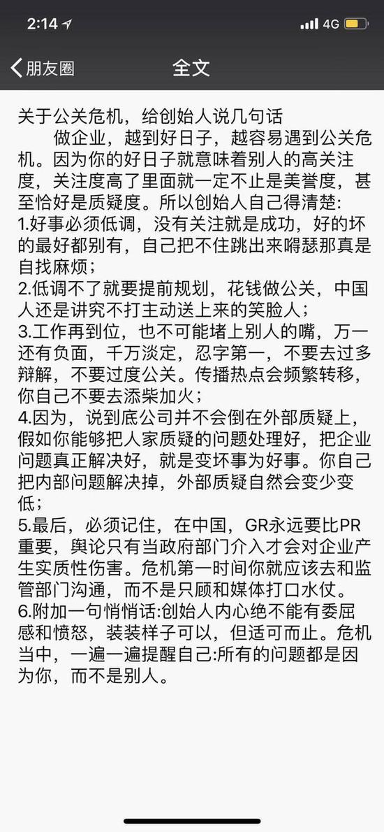 他表示,公司越到好日子,越容易出现公关危机,“但是创始人内心绝不能有委屈感和愤怒,装装样子可以,但适可而止。危机当中,一遍一遍提醒自己:所有的问题都是因为你,而不是别人。”