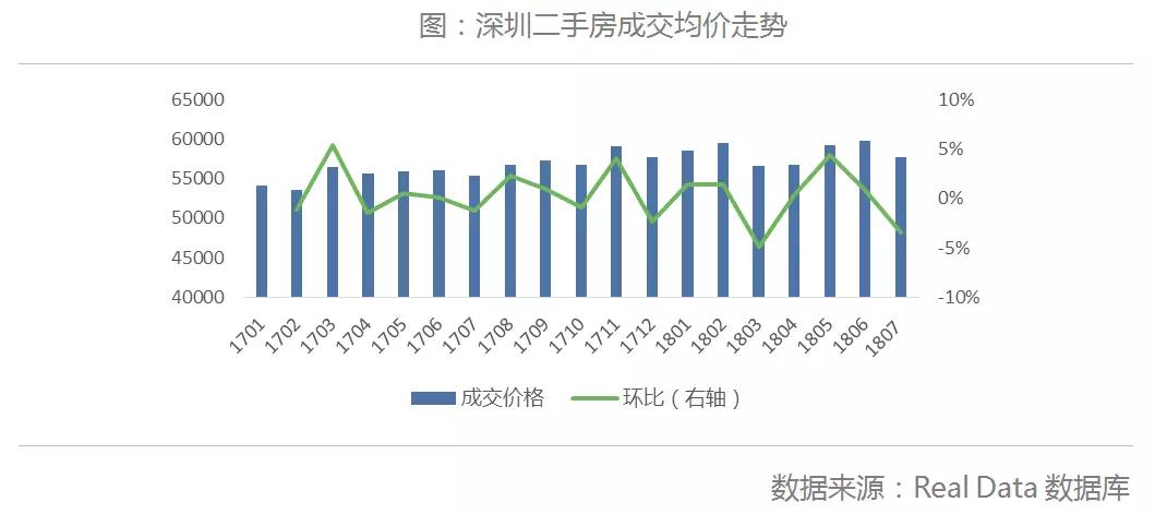 深圳2009年就已进入存量市场,2017年二手房成交占比71%,是以二手房为主导的市场。数据上来看,其二手房市场的表现更具有代表性。而2018年上半年深圳二手住宅成交3.4万套,环比减少2.5%,同比增长16.2%,但是整体处于较低水平。价格方面,2018年7月均价为57758元/平,环比下跌3.4%,同比上涨4%。从成交量和价格的角度,二手市场实际上是稳中有落,并没有个别新房表现的那么热。