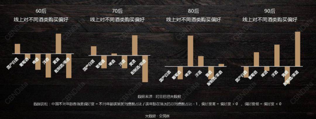 数据显示,60后、70后对于白酒的偏好度较高,而90后对于白酒的偏好度最低,他们更亲睐洋酒和果酒。