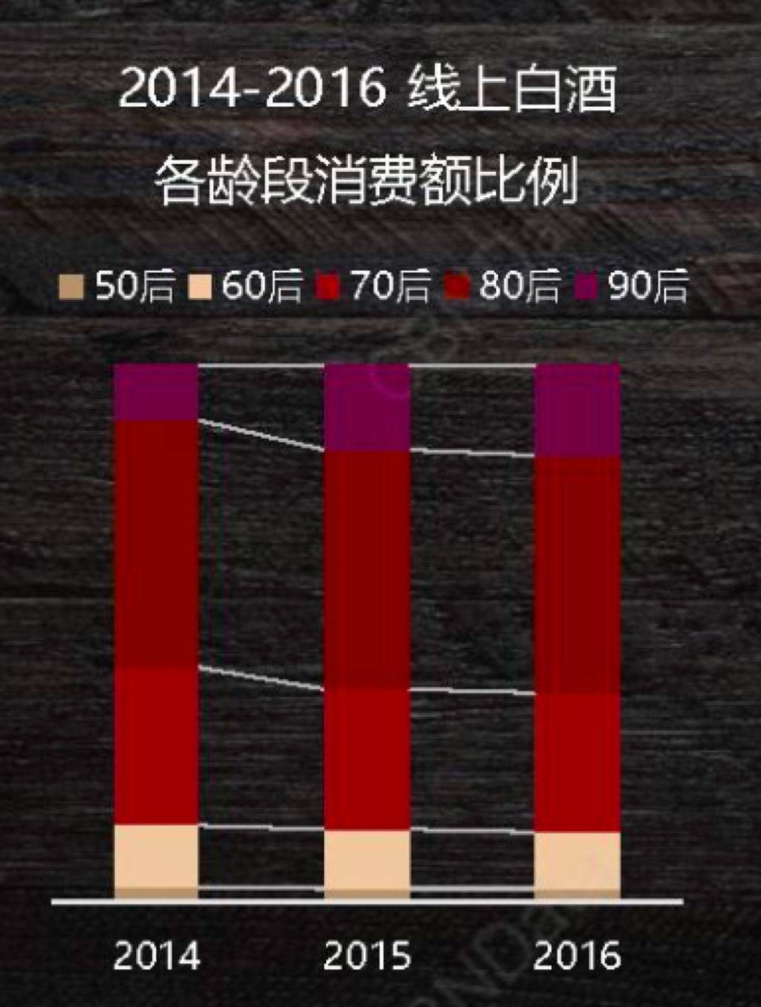 数据显示,线上白酒销售层面,80后是消费的主力军,90后对市场的贡献率也在提升。