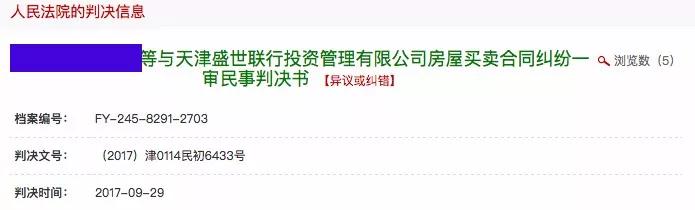 并且,网络上还能查到相关记录,天津盛世联行投资管理有限公司,因房屋买卖合同纠纷,而被多位购房者告上法庭。