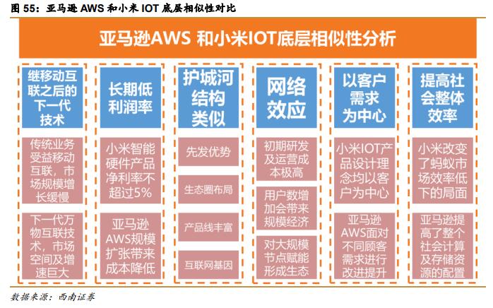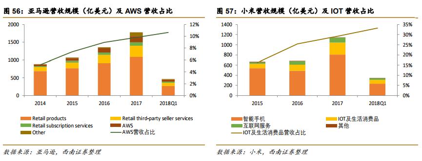 报告认为,亚马逊的传统业务电商以及小米的传统业务手机、笔记本电脑等都属于相当成熟的市场,现在都已经进入存量博弈阶段,而云计算和 IOT 是继移动互联之后的下一代技术,行业景气度较高,有望解构传统业务天花板。