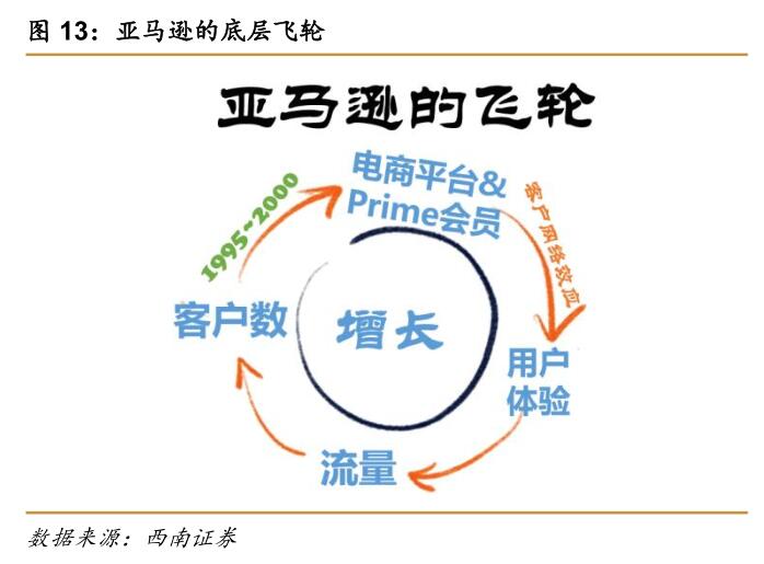 在这个层面,亚马逊电商平台通过多样化选择、高性价比商品、高速配送服务完成对原始客户的积累,随后 Prime 会员制度的推出通过高速物流与增值服务再次吸引消费者,形成极强的客户网络效应,这是亚马逊后续成功的关键基本盘。