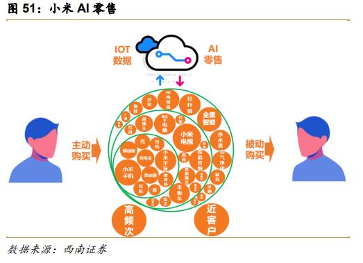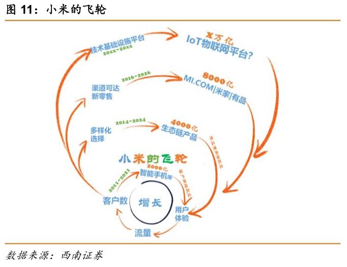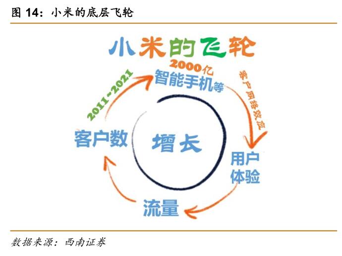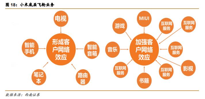 报告写到,小米底层飞轮业务主要由小米核心自研的内容承载类硬件产品和基于内容承载类硬件的互联网服务业务构成。其形成和增强客户网络效应的主要运营逻辑在于:通过核心自研硬件产品完成原始客户积累并形成一定的忠诚度,接着通过一系列互联网服务提高用户体验,增强用户粘性,从而增强客户网络效应。