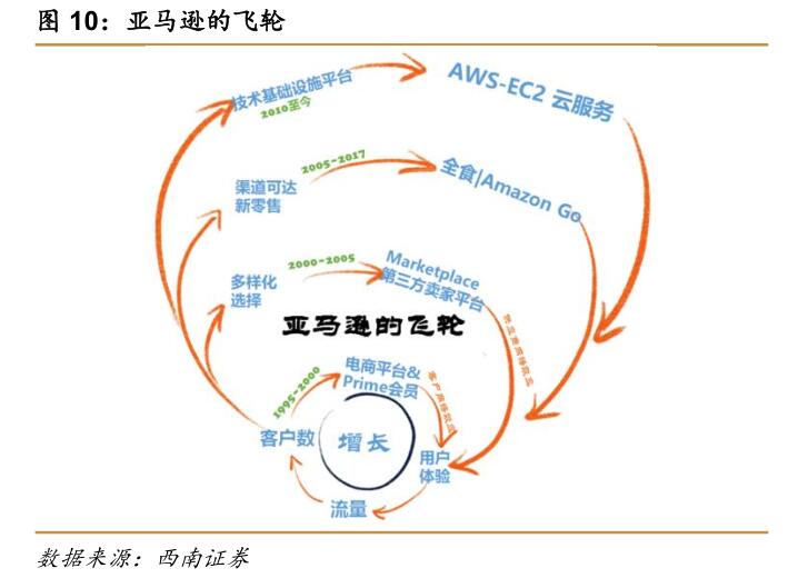 “飞轮效应”是亚马逊创始人贝佐斯提出的诠释亚马逊增长逻辑的核心运营思想,是一个可以从任何一个点开始但没有终点的闭环循环,核心在于以提升用户体验为中心推动公司的持续增长。