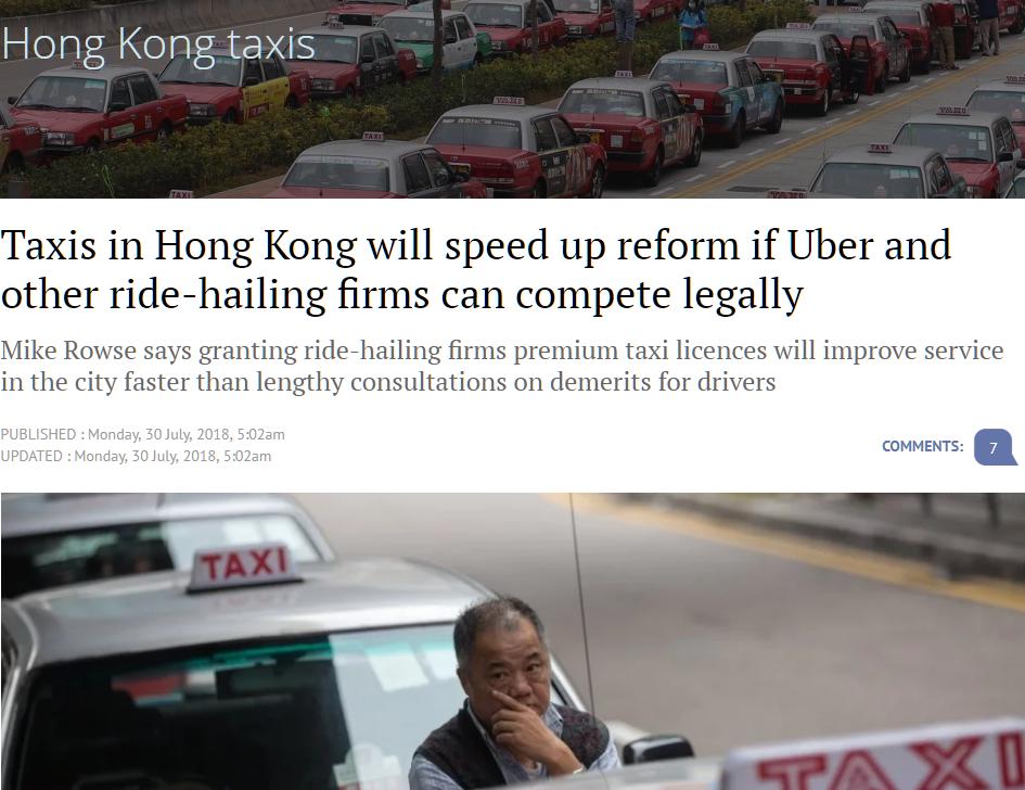 Mike Rowse呼吁,香港政府应向内地看齐,开放网约车公司合法参与竞争,将计划发放的出租车牌照发放给滴滴和Uber等全球领先的网约车公司,以通过市场机制提升司机服务品质,改善传统出租车行业,促进香港出租车行业加快改革步伐,真正成为智慧城市的“智慧管理者”。