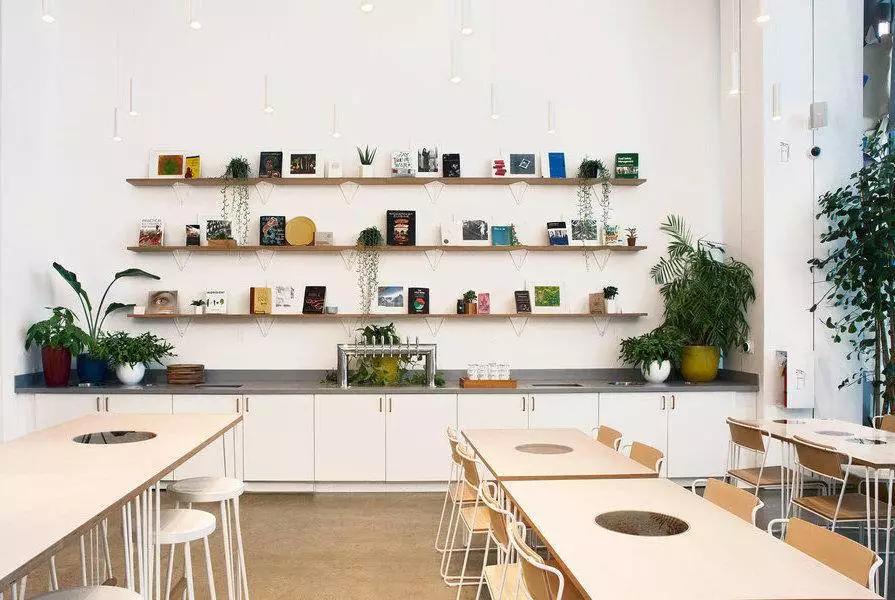 与此同时,在餐厅的另外一边,则是非常现代温馨的陈列。清新的木质桌椅,白色的高脚凳,还有精心挑选的烹饪书籍。