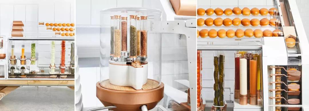 巨大的玻璃窗墙内,是令人震惊的一幕——餐厅一角,两台汽车大小的既复古又富有未来感的机器围绕中央操作台,正在“工作着”。红红绿绿的食材透过玻璃的管道容器映衬出来,告诉人们,这是一个全自动的汉堡机。