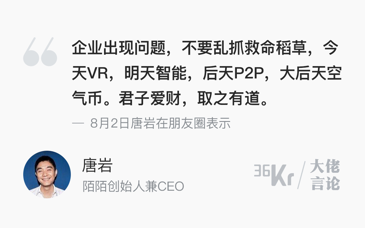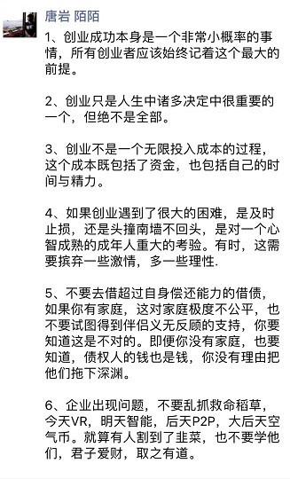 唐岩称:“企业出现问题,不要乱抓救命稻草,今天VR,明天智能,后天P2P,大后天空气币。就算有人割到了韭菜,也不要学他们,君子爱财,取之有道。”