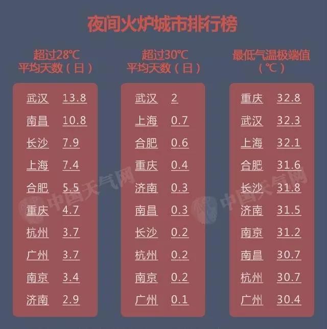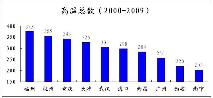 2017年中国气象局通过分析省会和直辖市最近31年的气象资料,得出了夏季炎热城市排名,前十分别是重庆、福州、杭州、南昌、长沙、武汉、西安、南京、合肥、南宁。