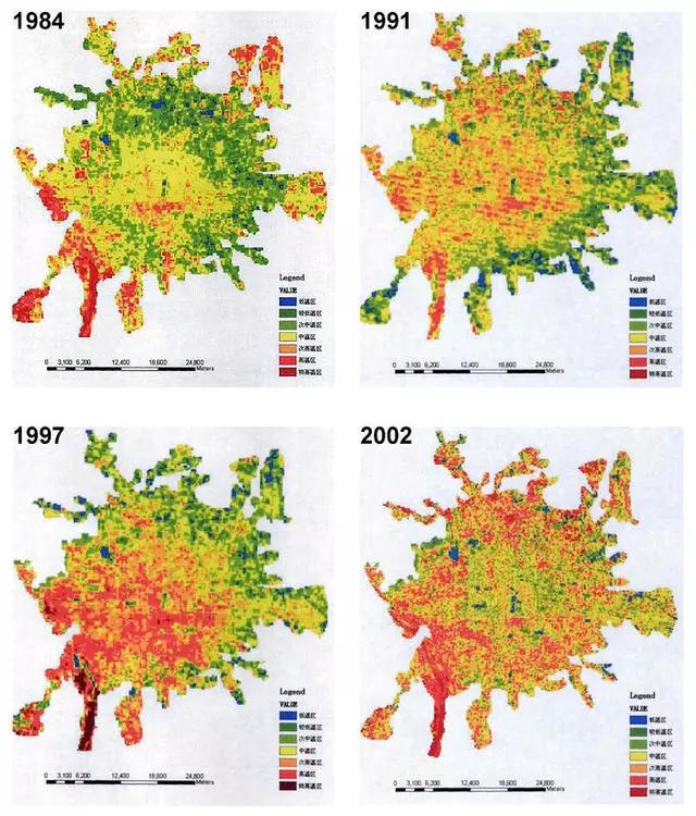 随着土地功能的改变,植被减少,硬化的地面取代土壤,工厂取代森林。城市化越高的地方这种改变越大,温度的变化越是明显。