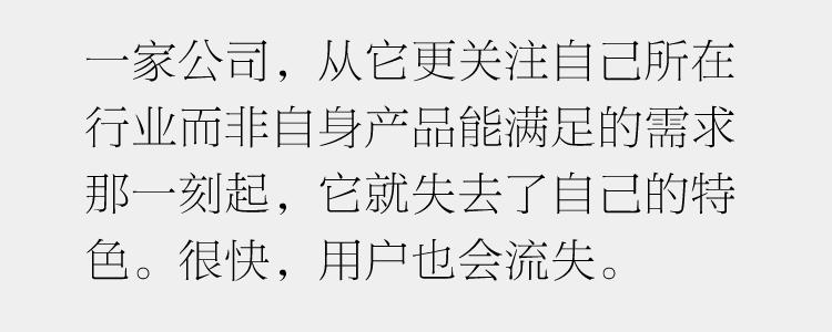 专注于产品的功用,而非其所处的产业、品类,会帮你发现真正的竞争对手。一家公司,从它更关注自己所在行业而非自身产品的那一刻起,它就失去了自己的特色。很快,用户也会流失。