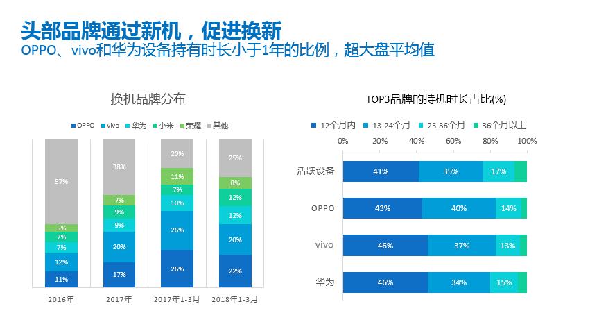 2016年开始大面积从新机市场进入换机市场,到2017年下半年,由于没有新的突破性技术的刺激,而且不久将来还有5G的到来,所以用户换机频率开始降低。换机市场,用户更加挑剔、谨慎,在换机率持续走低的情况下,厂商应该如何挖掘市场潜力呢?