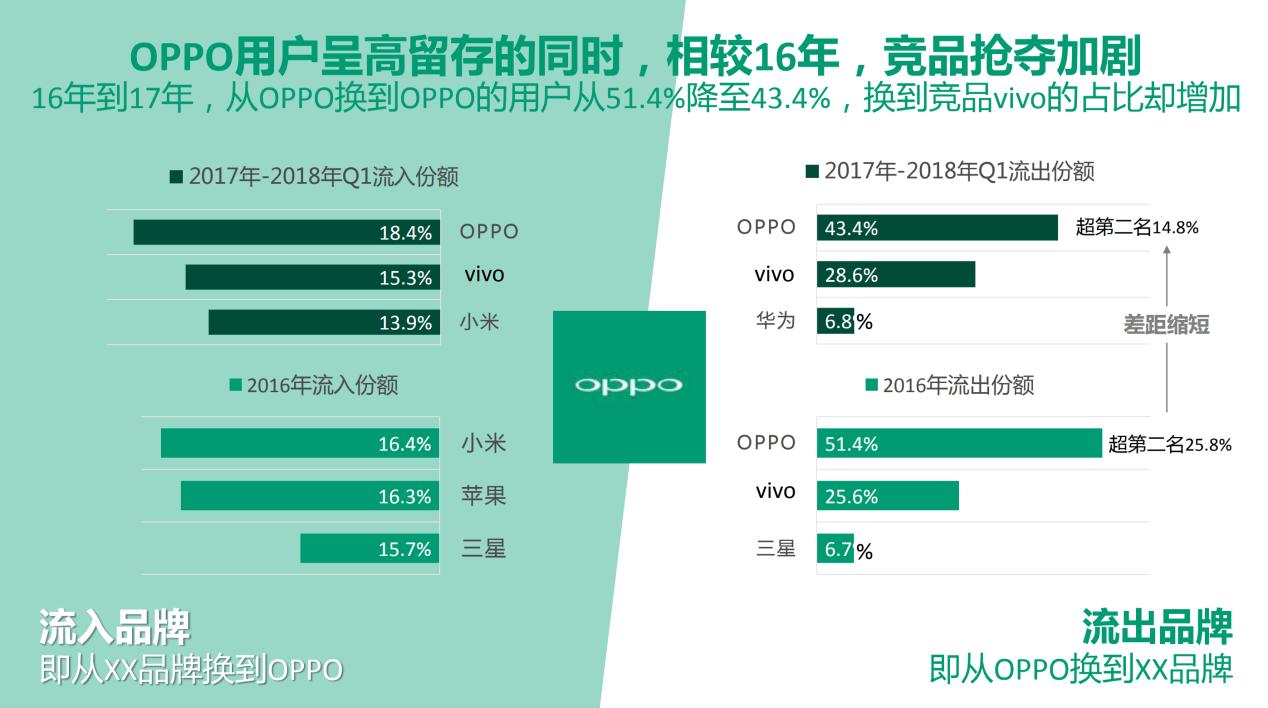 从具体的换机数据来讲,用户在OPPO与vivo之间切换也最为活跃。从下图数据我们看到,OPPO用户换机主要流向是OPPO和vivo,在2016年有少部分用户流向三星,而在而2017年三星在中国市场大溃败,这部分流出用户被华为吃掉。2017年-2018年第一季度,华为替代三星,成为OPPO流出用户的第三选择。