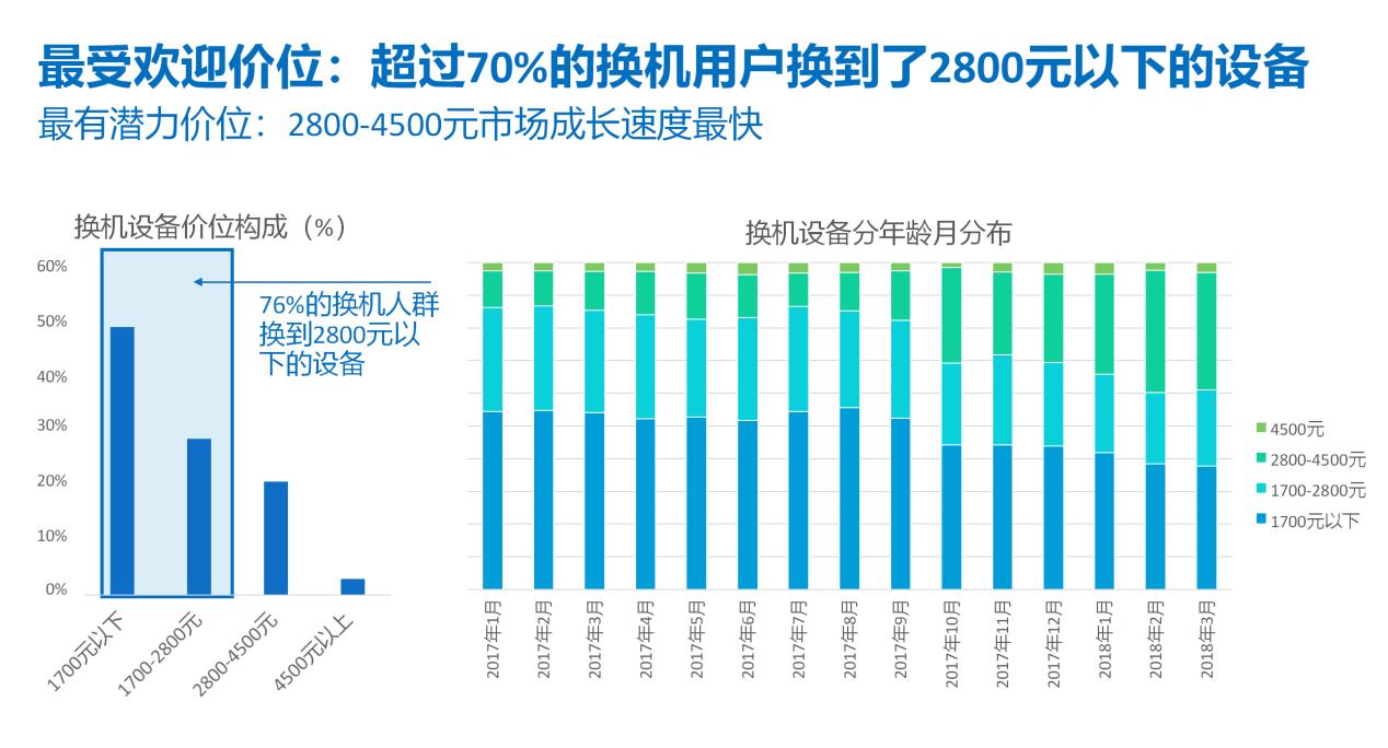 另外从价格的角度来看,超过70%的换机用户换到了2800元以下的设备,是目前最受欢迎价位段。而从潜力来看,2800-4500元的中高端产品成长速度最快,未来潜力最大。