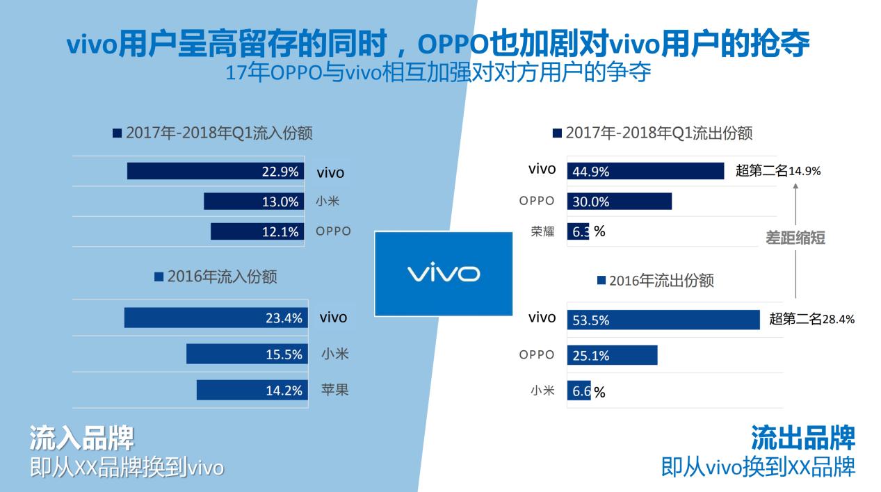 同样,vivo的用户也呈现高留存,而OPPO也加剧对vivo用户的抢夺。在vivo用户流出的去向来看,除了vivo和OPPO,2016年有一小部分流向小米,而这小部分用户到2017年-2018年Q1则流向荣耀。