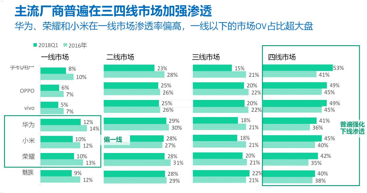 第三个密码是下沉市场。这个,其实不用多说,OPPO和vivo的崛起,有些像手机战场“人民的战争”,是农村包围城市的打法。近两年,三四线城市的用户成为所有企业用户增长的新动力,不仅是手机厂商, 我们看拼多多、趣头条、快手的崛起,也都是因为下沉用户被大面积唤醒,成为互联网的增量。OPPO和vivo将三四线城市的优势放大,向一二线城市上攻,而华为、小米、荣耀则火力全开,向下沉市场进军。