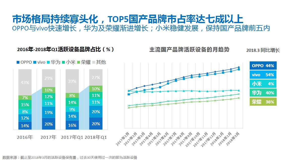 从腾讯社交广告发布的《2017-2018年第一季度国产手机行业报告》(以下简称《报告》)来看,截至2018年3月,安卓系统的总活跃移动设备数量达9.2亿,这一数据在2016年初是8亿左右,两年多时间有新增用户,也有用户第二部手机、第三部手机的增加,设备总量有所上涨。