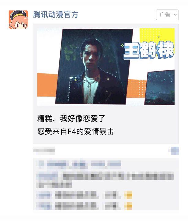 首先是为新F4量身打造的一轮主体为《爱情暴击》的沉浸式朋友圈广告,通过新F4中王鹤棣(新版流星花园中饰演道明寺)、官鸿(新版流星花园饰演花泽类)、梁靖康(新版流星花园饰演美作)、吴希泽(新版流星花园饰演西门)4人的剧情式视频,吸引了大量的粉丝和潜在漫画爱好者的关注。
