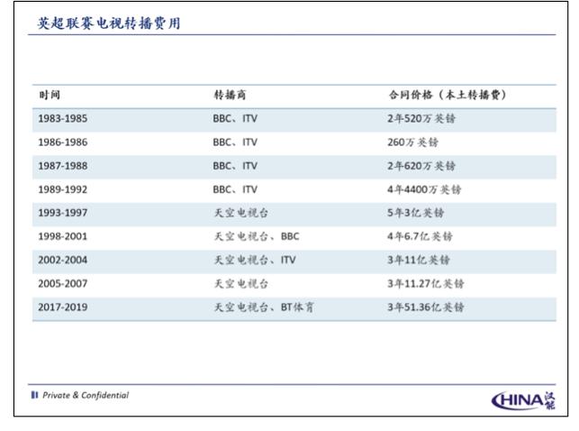 1992年,天空体育以3亿英镑的价格从BBC和ITV的手中获得英超5个赛季的媒体版权(年均6,000万英镑)。这一价格与上轮媒体版权价格(年均1,100万英镑)相比翻了近6倍。以此为契机,天空体育同步开始尝试推出付费订阅服务,并且一举扭亏为盈。