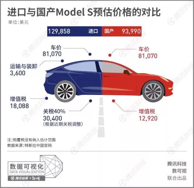 以美国生产、中国在售的Model S车型为例,消费者购买一辆进口Model S需要一笔支付运输与装卸费用、40%的关税和增值税。因此,要买到一辆在美国售价8万美元的Model S, 中国消费者最终需要支付的价格约14万美元。