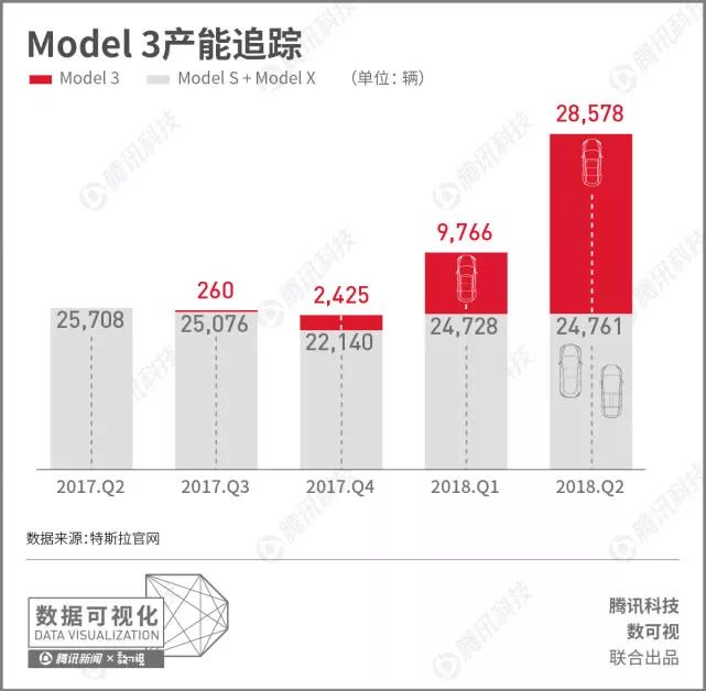 七月底,特斯拉实现了周产5000辆Model 3的目标。财报发布前,特斯拉就在其官网宣布Model 3 第二季度产量升至28578台,并且其余两款车型产量稳定。这个数字是上一个季度的近3倍,且在本季度已经超过了Model X和Model S产量的总和。马斯克还放出“将在八月底冲击周产6000辆Model3”的豪言。