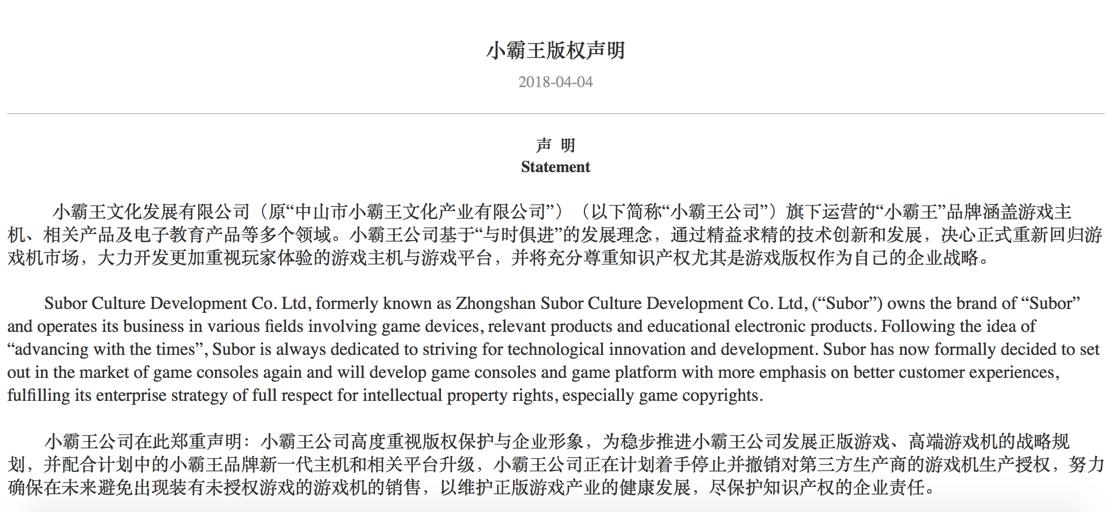 今年4月4日,小霸王发布声明称将回归游戏机市场,将大力开发更加重视玩家体验的游戏主机与游戏平台。小霸王表示,为推进发展正版游戏、高端游戏机的战略规划,并配合计划中的小霸王品牌新一代主机和相关平台升级,小霸王公司正在计划着手停止并撤销对第三方生产商的游戏机生产授权。