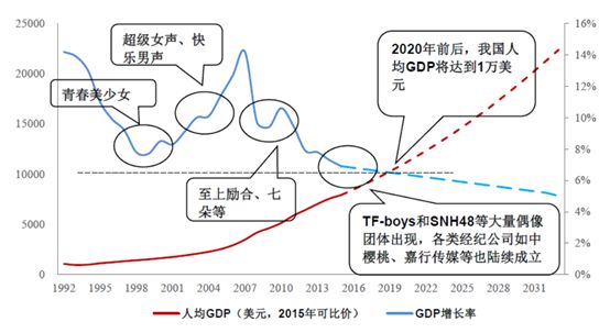 同为东亚经济体的日本、韩国,也在经济增长出现危机、不景气或增速下滑等拐点时,迎来了“粉丝经济”的爆发。而当前国内“粉丝经济”的爆发,或许也反映了宏观经济回落过程中,人们需要依赖偶像进行心理补偿的因素。