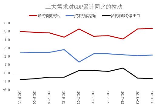 但值得注意的,2018年上半年,固定资产投资累计同比增速为6.0%,较2017年全年回落了1.2个百分点,可以在一定程度上解释资本形成总额对GDP的拉动效果回落。而社会消费品零售总额累计同比增长9.4%,也较2017年全年回落了0.8个百分点。