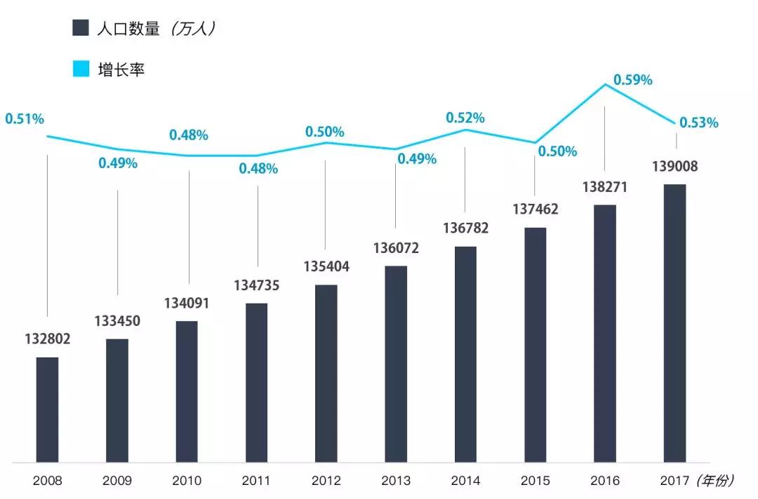 2008-2017年中国人口总量及增速