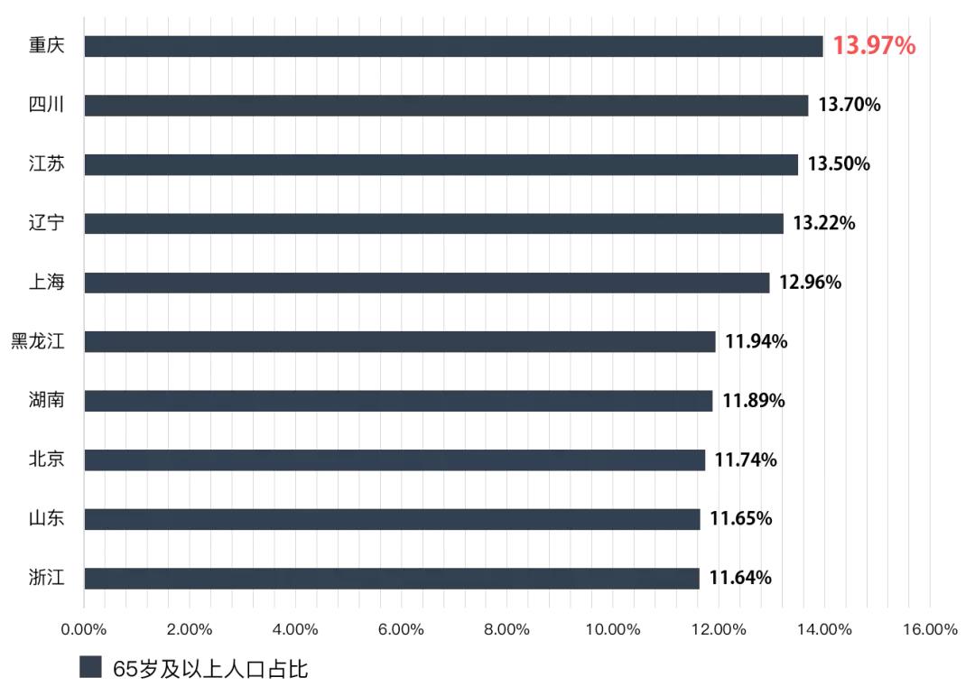 从地域分布来看,中国老龄化最严重的省份主要分布在西南、东北和北上苏杭一带。老龄化体现的并不是单一常住人口的变化,与人口的流动也有密切关系。西南和东北共同的特征有两个:一个是计划生育严格执行,一个是青年劳动力输出大省。北上苏杭经济发达,生活医疗条件相对较好,能为老年人生活提供相对完善的保障。